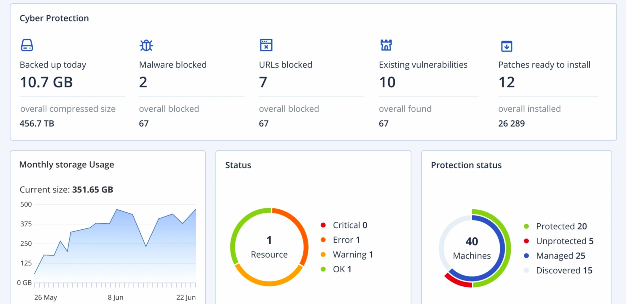 Simplified, at-a-glance reporting helps streamline your operations while giving you the insight you need to successfully protect your data. Customize your dashboard’s widgets to view reports on drive health, active alerts, missing updates and more – enabling you to quickly identify and remediate problems.